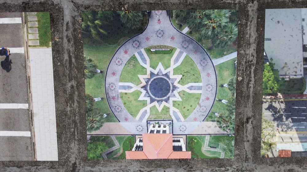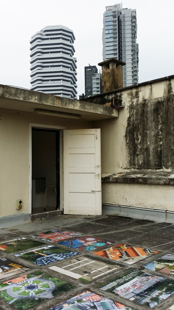 Two levels up on the open-air rooftop, a matrix of 25 photos, centred around the perspective of a bird’s-eye view, is plastered on the floor. The placement of this particular set of images on the rooftop is a purposeful statement—indeed, a statement made more obvious than the gallery exhibition given the stylistic aerial theme of this collection.