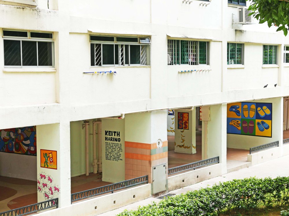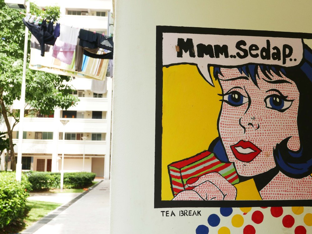 The following weekend, I returned to the site at Block 8 Holland Avenue. There, I encountered wall after wall and column after column of graphic murals in the likes of Andy Warhol, Keith Haring, and Roy Lichtenstein. The whimsical interpretations, which include merlions, kopi cups, and Ayam brand soup cans, inject an indisputable local flavour. Indeed, this void deck does not hide its attention-seeking tactics. Launched in 2012, the mural project at Block 8 was a joint collaboration between Buona Vista Grassroots Organizations and Social Creatives (a non-profit social enterprise).