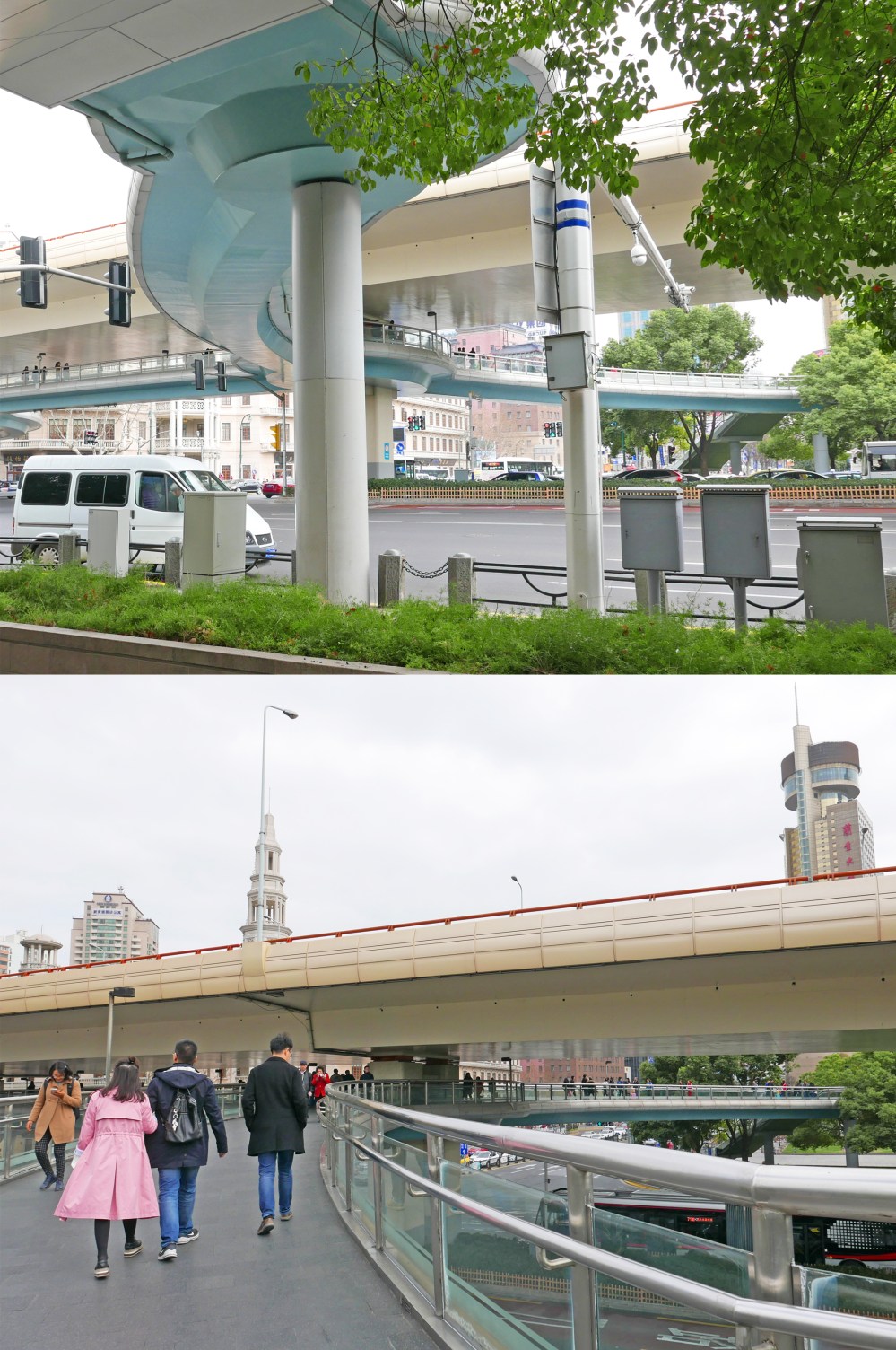 Plate 1. Circular pedestrian bridge located above the Mingzhu roundabout in the heart of the Lujiazui financial district. This elevated sidewalk offers captivating views of Shanghai’s landmark skyscrapers: Oriental Pearl TV Tower, Jin Mao Tower, Shanghai International Finance Centre, and Shanghai Tower. The vertical separation of pedestrians and vehicles could be interpreted as a strategy of “place promotion” for it is here, in this dense concentration of modern spectacles, that spectators are swathed by unobstructed visual connections to the power symbols of Shanghai’s globalization agenda. Photographed by Su-Jan Yeo, 2018.Plate 2. Pedestrian bridge located at a major traffic junction near People’s Square. This elevated sidewalk is sandwiched above the intersection of Xizang Middle Road / Yan’an East Road and below the Yan’an Expressway. In contrast to the Lujiazui circular pedestrian bridge, this particular infrastructure is focused on function over form. However, a crucial observation worth emphasizing with regards to elevated sidewalks in general is the issue of design for universal accessibility. It is without surprise that such challenging pedestrian bridges are often absent of the elderly, children in strollers, and wheelchair users. Photographed by Su-Jan Yeo, 2018.